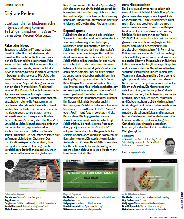 ← Alle News Presse 12. Mai 2018 “Digitale Perle” ReportExpress 2 Fotos ReportExpress als „Digitale Perle“ in der neuen Ausgabe des Medium Magazins (Seite 10). GROSSARTIG.